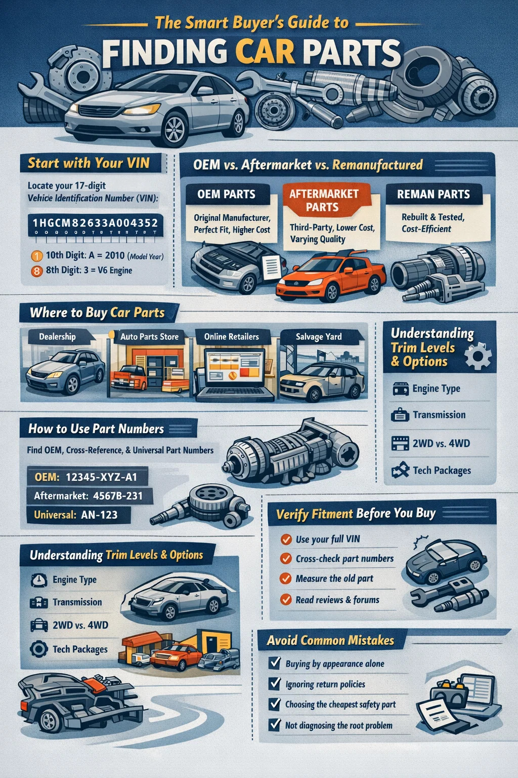 Nalezení správných dílů pro váš vůz spočívá v jednom nesmlouvavém výchozím bodu: musíte znát rok, značku, model, objem motoru a úroveň výbavy svého vozidla, než začnete hledat automobilový díl . Bez těchto informací může i část, která vypadá identicky, selhat nebo správně fungovat. Jakmile tyto podrobnosti uzamknete, proces se stane mnohem jednodušším – ať už nakupujete u prodejce, online prodejce, na sběrném místě nebo v obchodě s autodíly. Tato příručka vás provede každým krokem tohoto procesu s praktickými detaily.