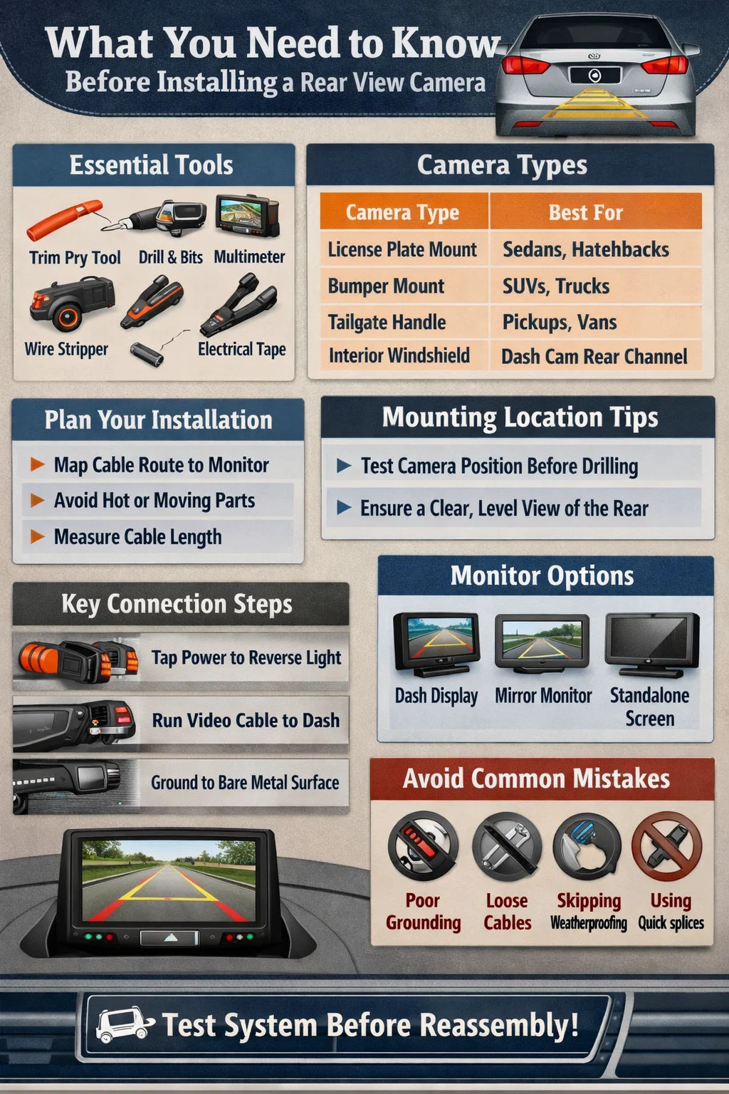 Zadní kamera je jedním z nejpraktičtějších automobilových dílů souvisejících s bezpečností, které můžete přidat do jakéhokoli vozidla. Při správné instalaci pomocí kroků popsaných v této příručce poskytuje roky spolehlivé služby, eliminuje riziko couvání do překážek, které nevidíte, a může být rozhodujícím faktorem pro předcházení nehodám při nízké rychlosti na parkovištích – situacím, které představují zhruba 20 % všech kolizí vozidel každoročně hlášeno na hlavních trzích. $