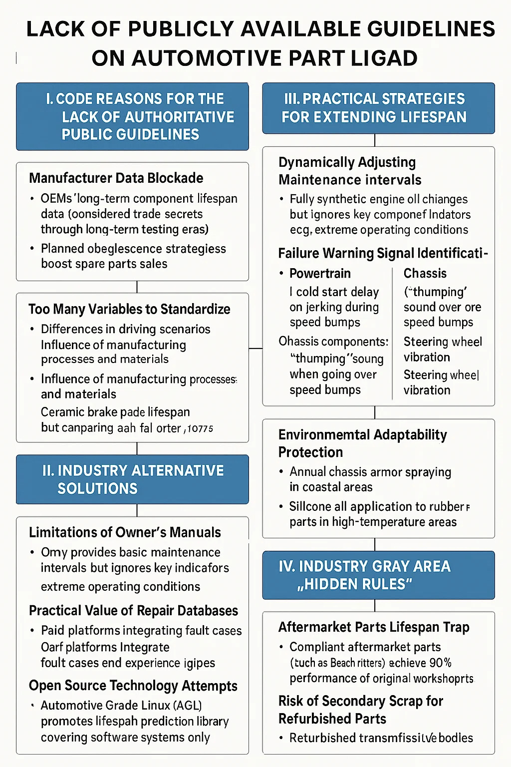 V odvětví oprav automobilů neexistuje jediný, veřejně dostupný návod, který by komplexně pokrýval životnost všech automobilové díly . Tato situace pramení ze složitosti odvětví a vlivu více proměnných. Následuje klíčová analýza těchto faktorů: