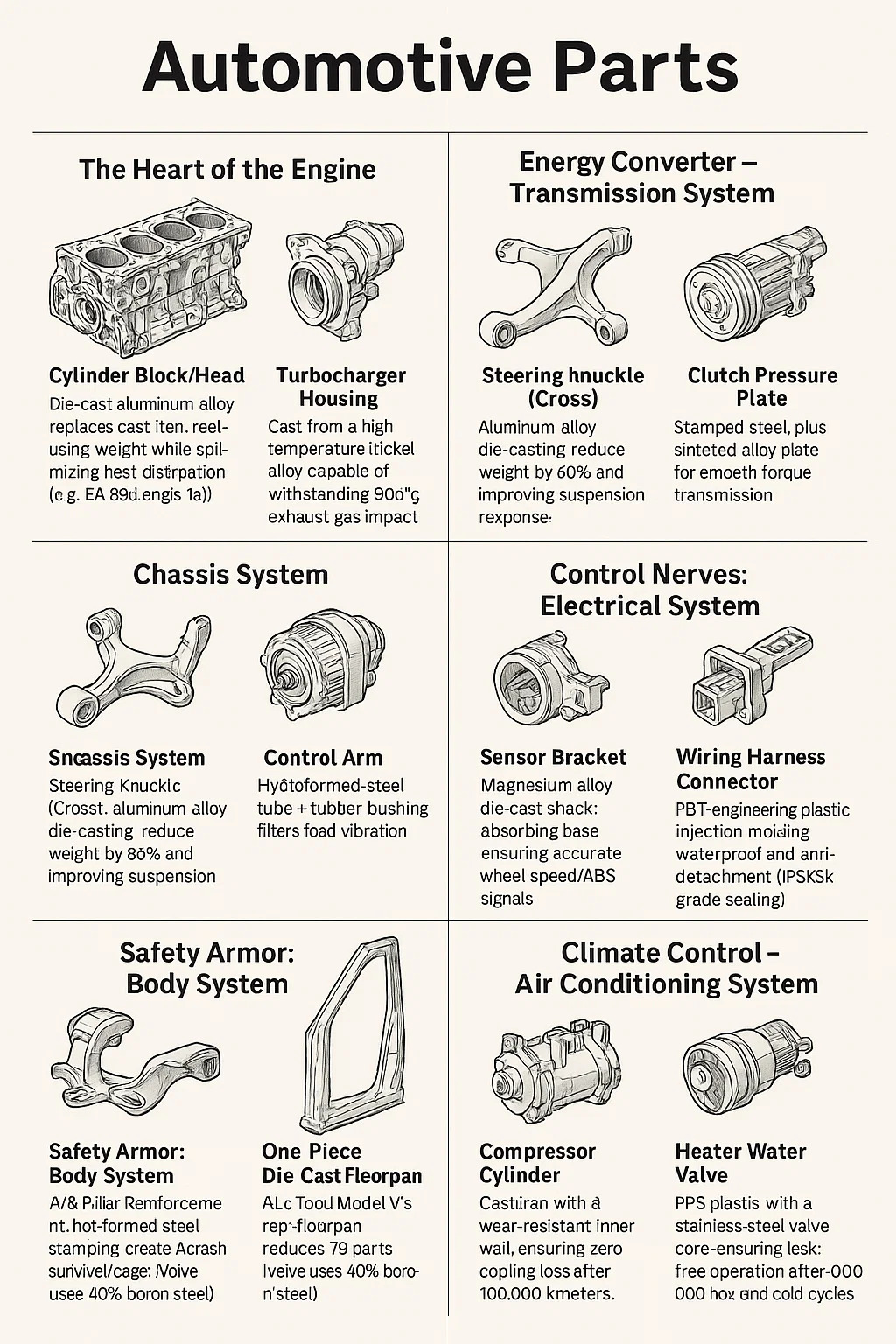 Díly automobilů zahrnují stovky funkčních jednotek, které tvoří vozidlo, rozdělené do šesti klíčových systémů.
