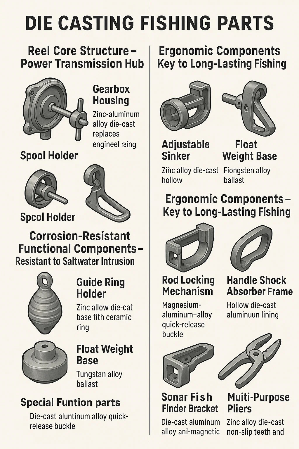 Zemřít lití rybářských částí jsou komponenty jádrových kovů vyrobené pomocí vysokotlakého procesu lití. Zabývají se klíčovými požadavky na rybářské řešení, jako je lehký, odolnost proti korozi a funkční spolehlivost. Klíčové aplikace a funkce jsou následující: