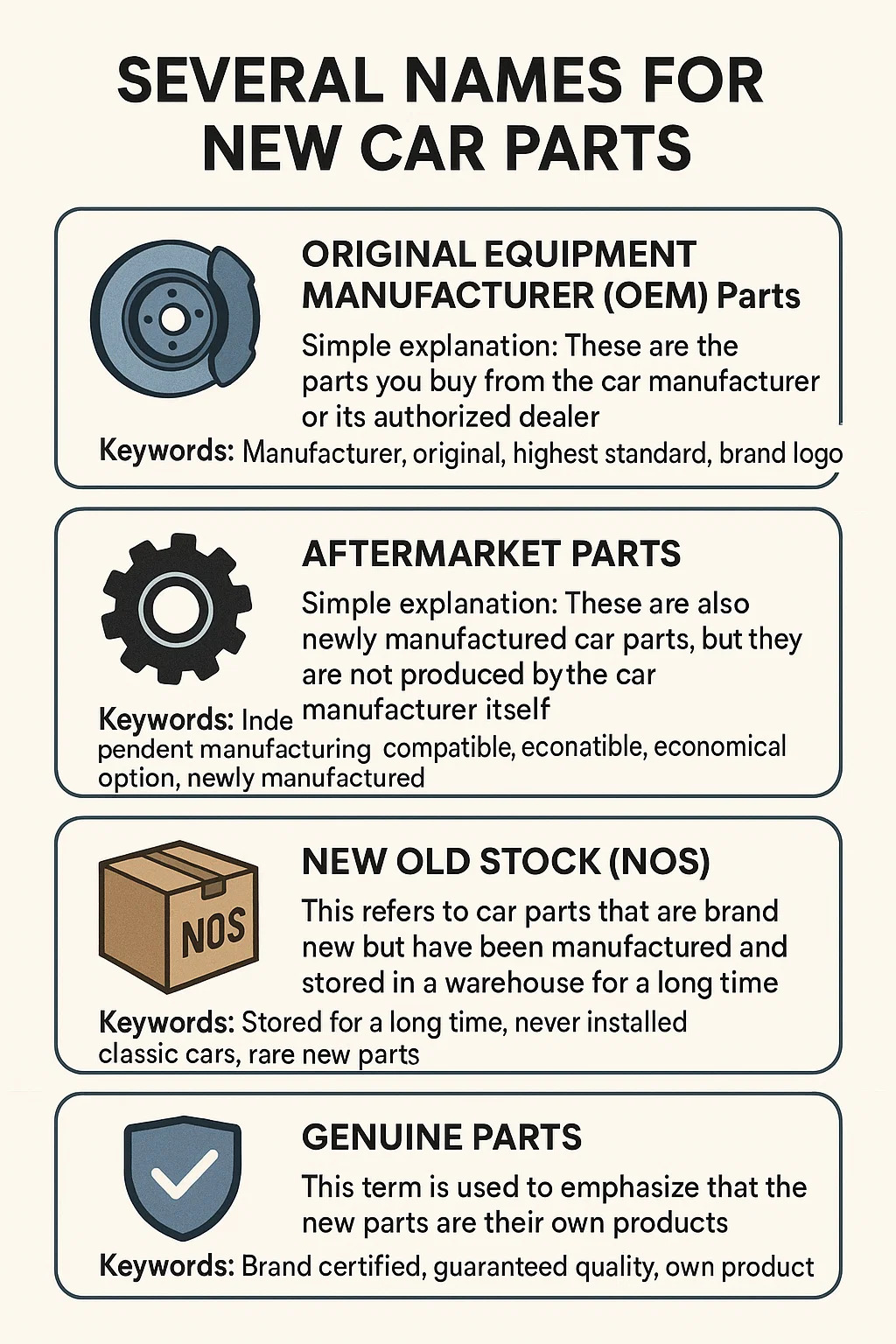 Zcela nové autodíly mají několik běžných názvů, které se mírně liší v závislosti na jejich zdroji a povaze.