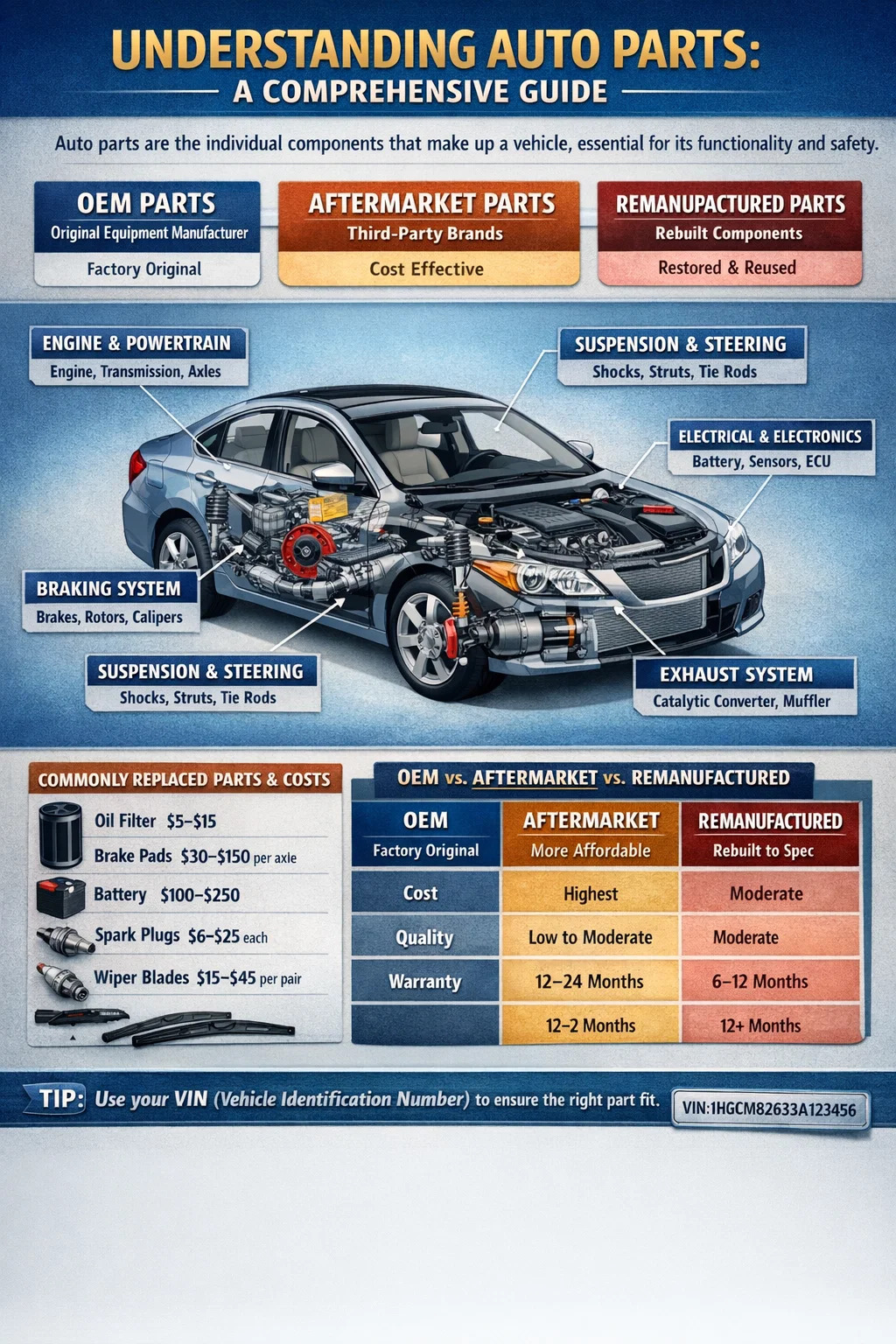 Na nejzákladnější úrovni se autodíly dělí do dvou širokých kategorií: OEM (Original Equipment Manufacturer) díly a náhradní díly . OEM díly jsou vyráběny původním výrobcem vozidla nebo pro něj a jsou totožné s tím, co bylo s vozem dodáno z továrny. Náhradní díly jsou vyráběny společnostmi třetích stran a mohou se lišit v kvalitě, ceně a přizpůsobení. Třetí kategorie – repasované nebo repasované díly – se týká použitých součástí, které byly zrestaurovány tak, aby splňovaly původní výkonové specifikace.