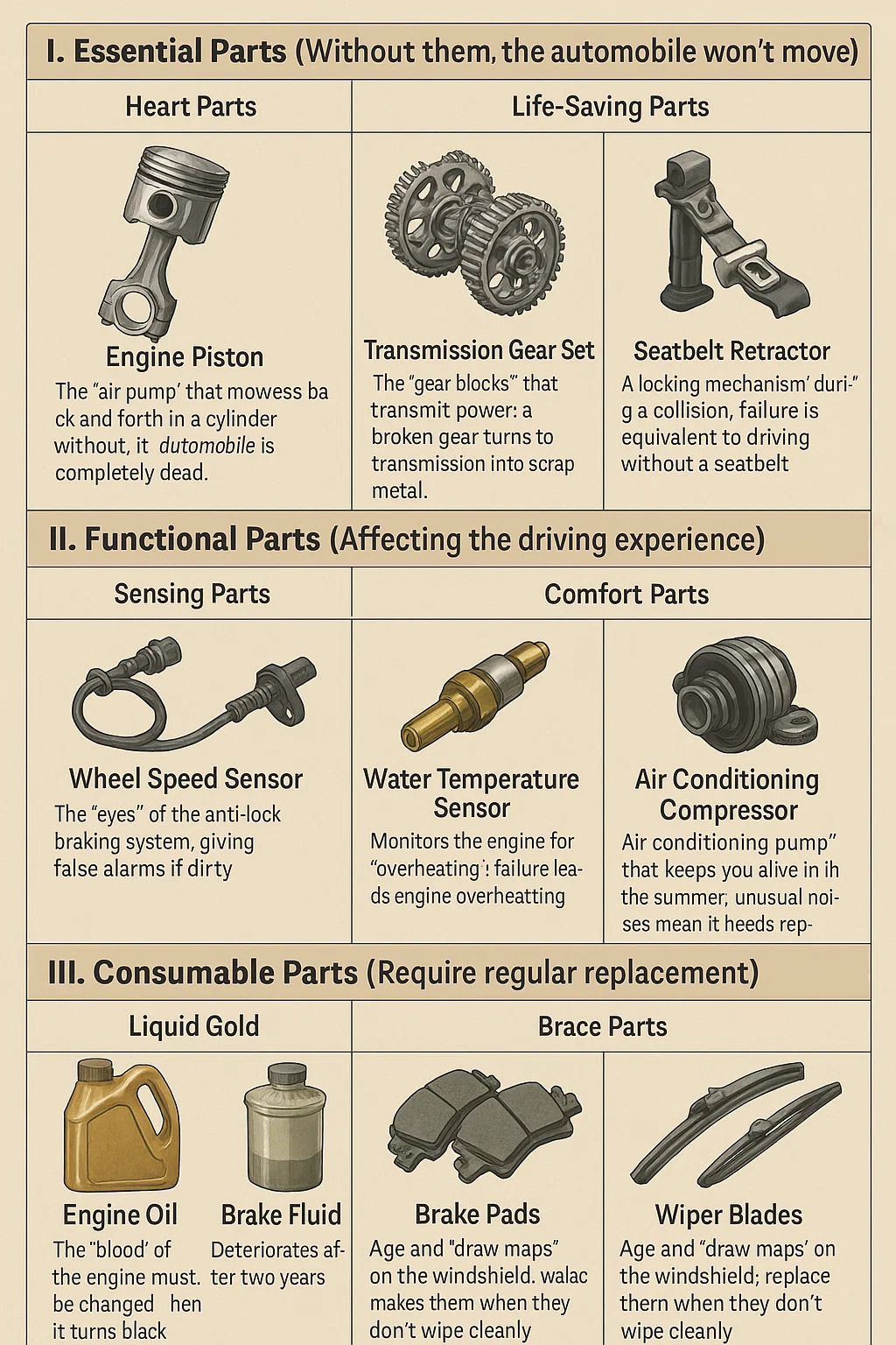 Automobilové díly jsou "orgány", které tvoří automobil; Chybějící klíčová část činí automobil nefunkčním, zatímco další ozdobné díly jej pouze dělají honosnějším.