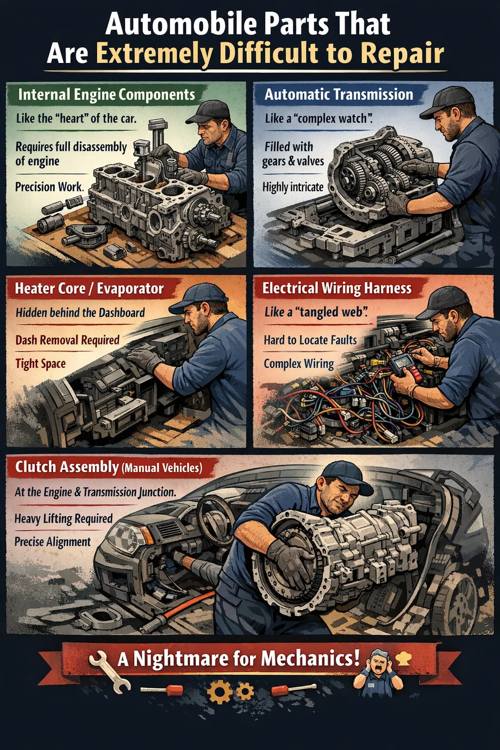 V autoopravárenském průmyslu, někteří automobilové díly jsou pro techniky k opravě „noční můrou“. Není tomu tak proto, že by samotné díly byly drahé, ale proto, že jejich umístění je tak obtížně dostupné nebo jejich struktura je tak složitá, takže opravy jsou časově náročné a pracné.